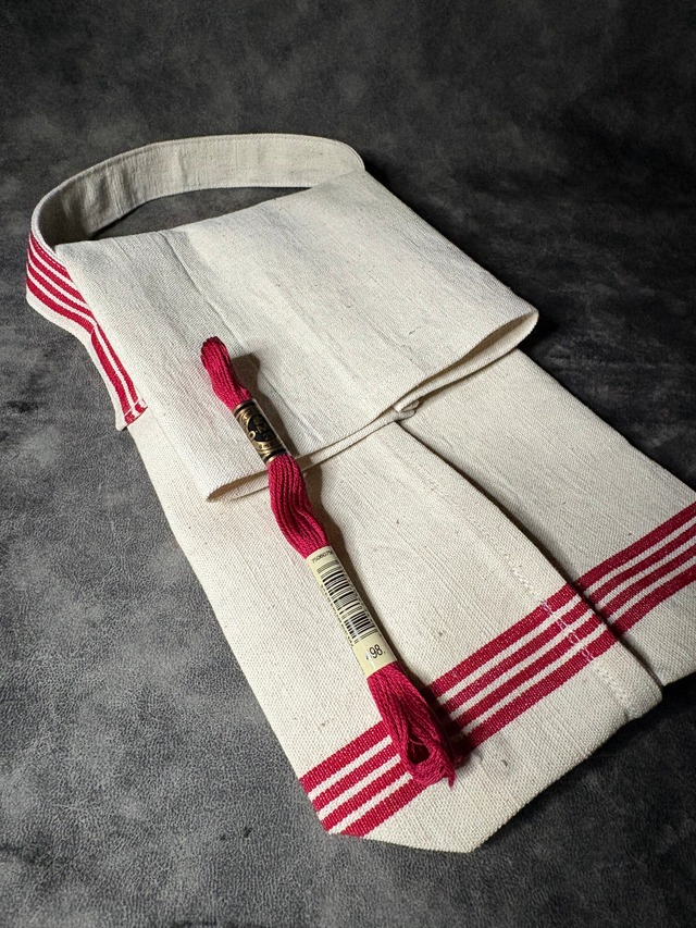 アンティークのリネン生地を使用した、ボックスティッシュケースです。 古いファブリックならではの、 経年による色の変化や風合いが生地の中に見られるところもあります。 また、リネン特有のネップ(糸の節)もところどころにございます。 そうした“時間を重ねた味わい”も、この生地の魅力としてお楽しみください。 こちらの生地は、 Aタイプのストライプレッドよりも ハリのある、しっかりとした質感のリネン生地です。 長い年月を経たファブリックのため、 保管時についた畳み跡によるわずかな変色が見られる箇所があります。 できるだけ目立たない位置になるように裁断しておりますが、 アンティーク生地の特性としてご理解ください。 赤いボーダーラインを本体の下部と持ち手部分にあしらい、 キリッとした可愛らしさのある仕上がりになっています。 フタの内側は、 赤い糸で大きなステッチを入れ、簡単に縫い合わせております。 そのままでもティッシュケースとしてお使いいただけますが、 この作品は “フタ部分に刺繍を施して楽しんでいただくこと” を コンセプトにお作りしています。 お好きな図案やオリジナルのデザインで、ぜひ刺繍をお楽しみください。 刺繍をされる際は、一度赤い糸を外していただくと作業がしやすくなります。 刺し終わりましたら、また簡単に縫い合わせていただければ大丈夫です。 針は付属しませんが、 深みのある赤色が美しい DMC刺繍糸 No.498 を1束お付けいたします。 【サイズについて】 私が普段使っている薄型のティッシュのサイズは 幅約23cm、奥行き約11cm、高さ約4.5cm 幅(掛けた時の高さ)については十分余裕がありますが、 箱の胴回りになる奥行き・高さついては、 普段お使いのものと比較、確認をお願いいたします。