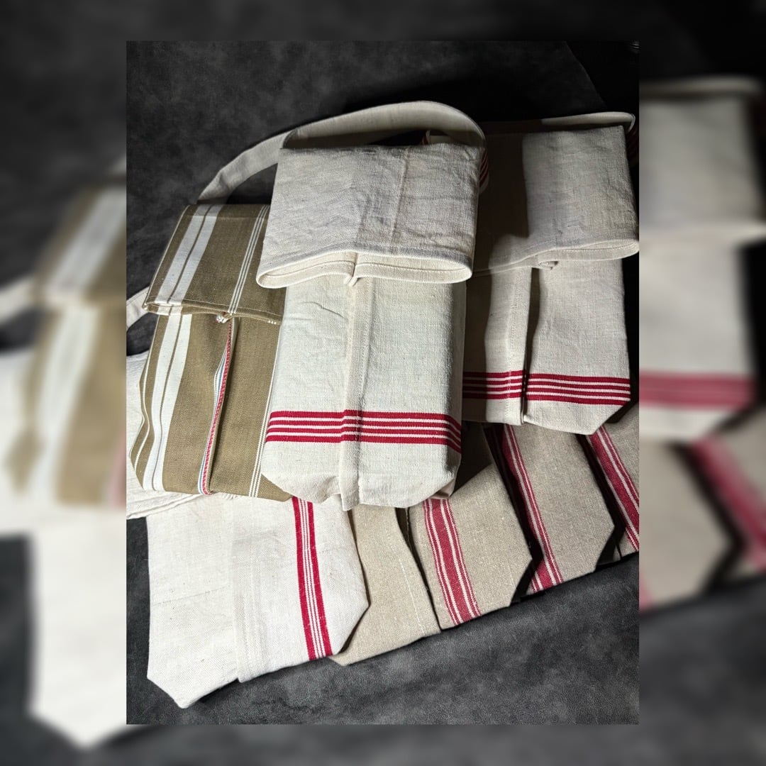 アンティークのリネン生地を使用した、ボックスティッシュケースです。 古いファブリックならではの、 経年による色の変化や風合いが生地の中に見られるところもあります。 また、リネン特有のネップ(糸の節)もところどころにございます。 そうした“時間を重ねた味わい”も、この生地の魅力としてお楽しみください。 使用している生地は、 しっかりとした厚みがありますが、柔らかさもあり、 全体にランダムなボーダー柄が印象的です。 よく見るとヘリンボーン織りのような織り模様が浮かび上がっているのも特徴です。 持ち手部分は同じ生地から取れなかったため、 無地の別布を使用し、 その上に麻のテープを縫い付けて仕立てています。 生地の耳にはブルーと赤のラインが入っており、 そのラインがデザインのアクセントとなるよう配置しています。 刺繍を加えることで、さらにグッと雰囲気が変わりそうです。 どんな図案を刺すか考えるところから、楽しんでいただけたら嬉しいです。 フタの内側は、 赤い糸で大きなステッチを入れ、簡単に縫い合わせております。 そのままでもティッシュケースとしてお使いいただけますが、 この作品は “フタ部分に刺繍を施して楽しんでいただくこと” を コンセプトにお作りしています。 お好きな図案やオリジナルのデザインで、ぜひ刺繍をお楽しみください。 刺繍をされる際は、一度赤い糸を外していただくと作業がしやすくなります。 刺し終わりましたら、また簡単に縫い合わせていただければ大丈夫です。 針は付属しませんが、 深みのある赤色が美しい DMC刺繍糸 No.498 を1束お付けいたします。 【サイズについて】 私が普段使っている薄型のティッシュのサイズは 幅約23cm、奥行き約11cm、高さ約4.5cm 幅(掛けた時の高さ)については十分余裕がありますが、 箱の胴回りになる奥行き・高さついては、 普段お使いのものと比較、確認をお願いいたします。