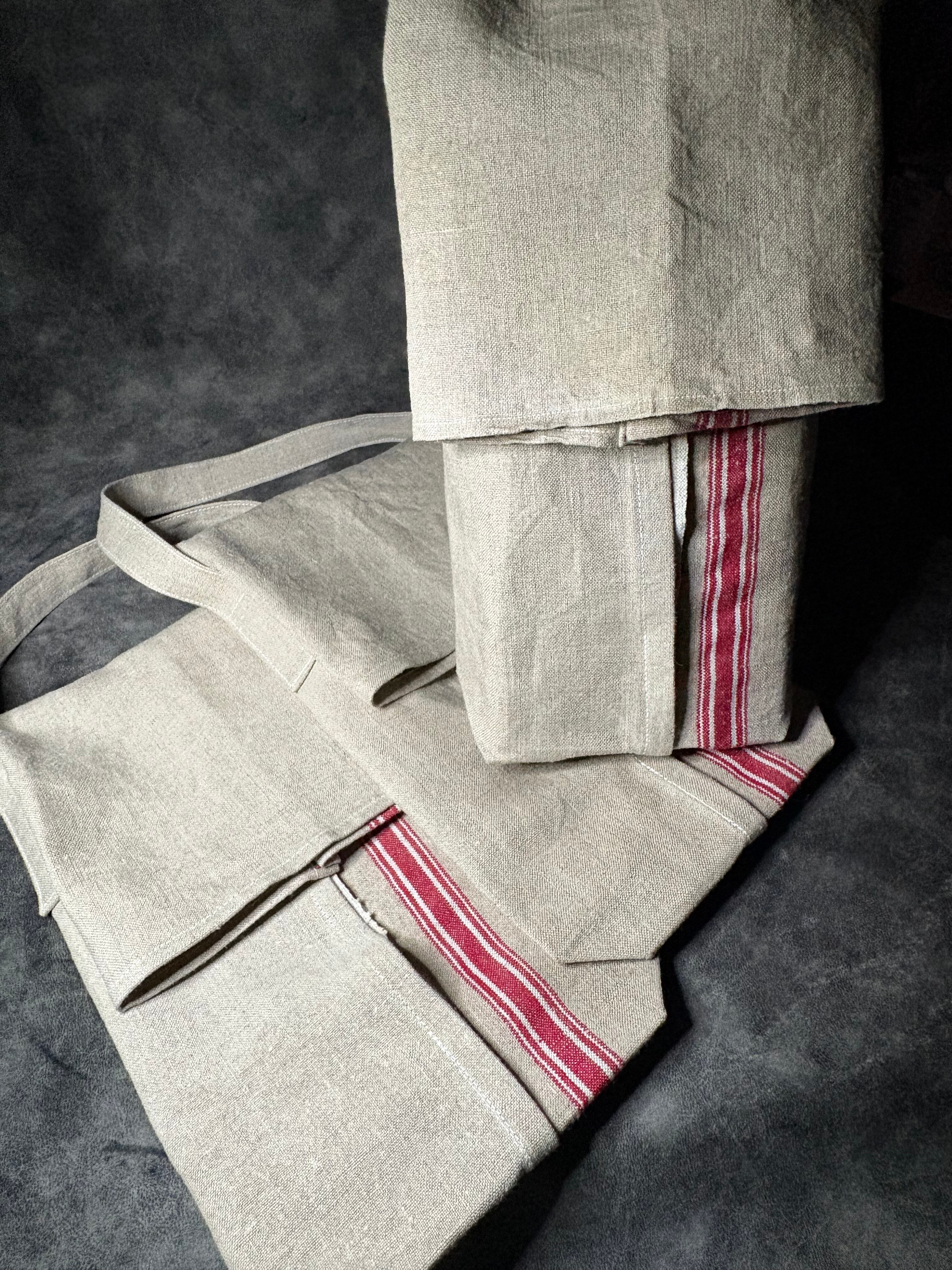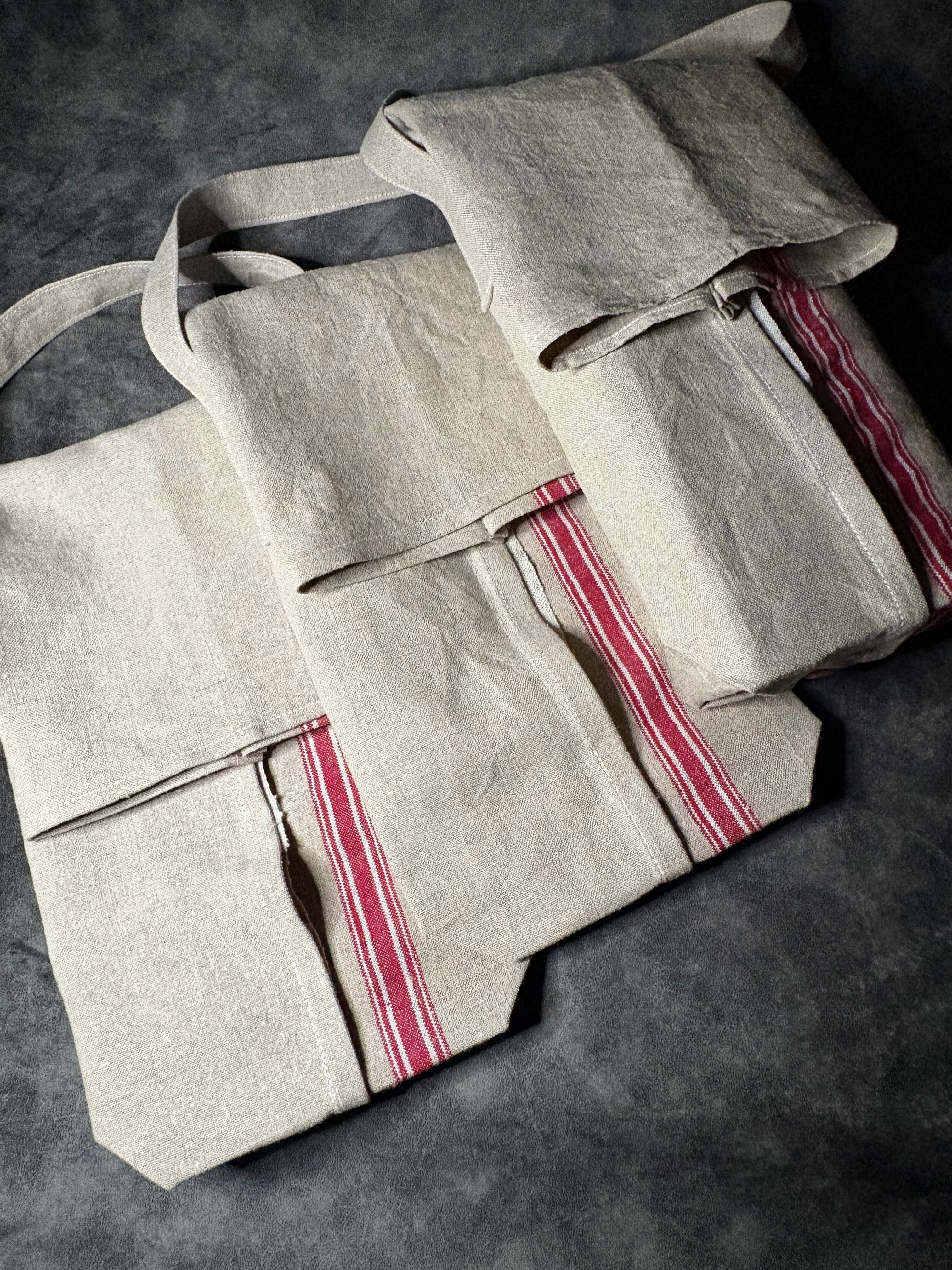4.アンティーク生地のボックスティッシュケース【C-2やわらか生成のストライプレッド】
